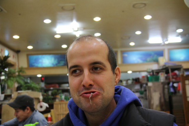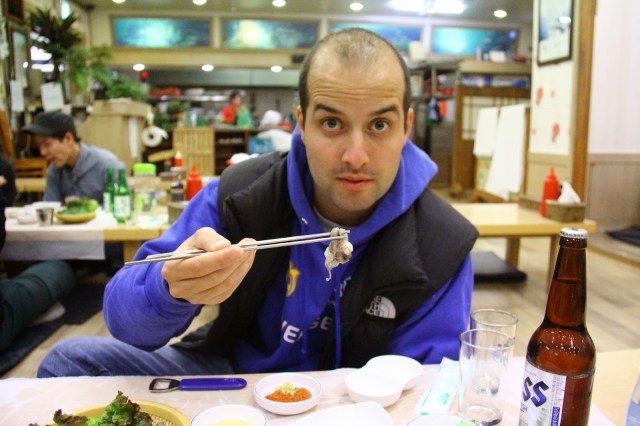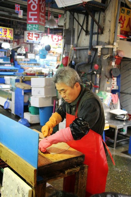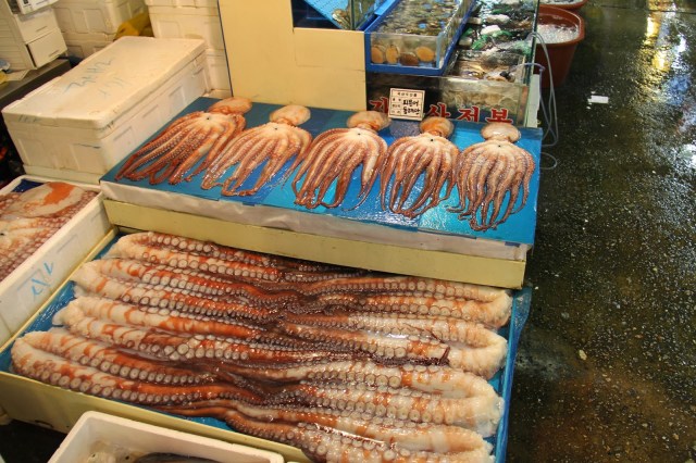 After watching for a while we decided to head down to one of the smaller vendors and buy something to eat for breakfast. We ended up eating flounder served like sashimi and fresh octopus that was still moving. The octopus would stick to the sides of your mouth until you chewed it enough that it stopped. This was one of the cuisines that I’ve wanted to try for some time. I had expected that it wouldn’t be very tasty but was pleasantly surprised. The preparation consists of salting then dipping it in sesame seed oil making it pretty tasty.