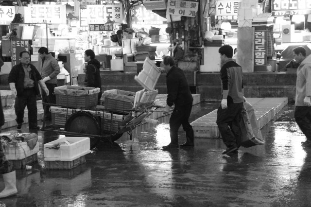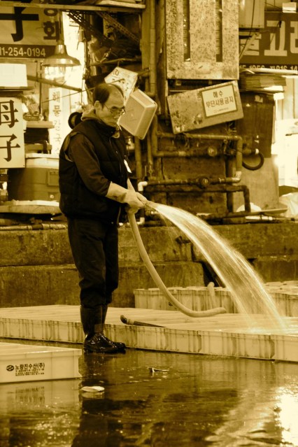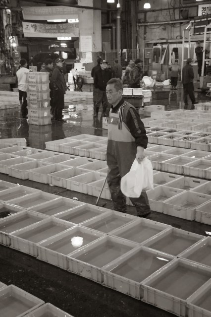 | The auctioneer, my Korean isn’t too hot but there was no way I was going to understand him. He is standing on a little cart that would be driven from place to place to auction off different types of fish. |