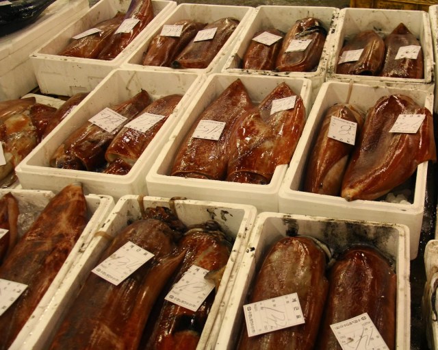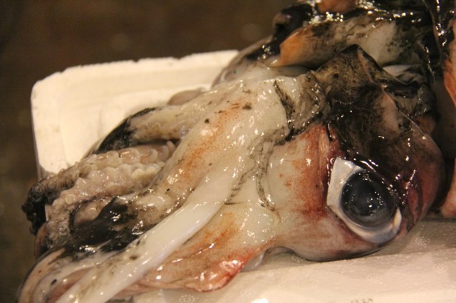 | A bunch of squid on display. The papers list the weight so the buyers know what they are bidding on. |