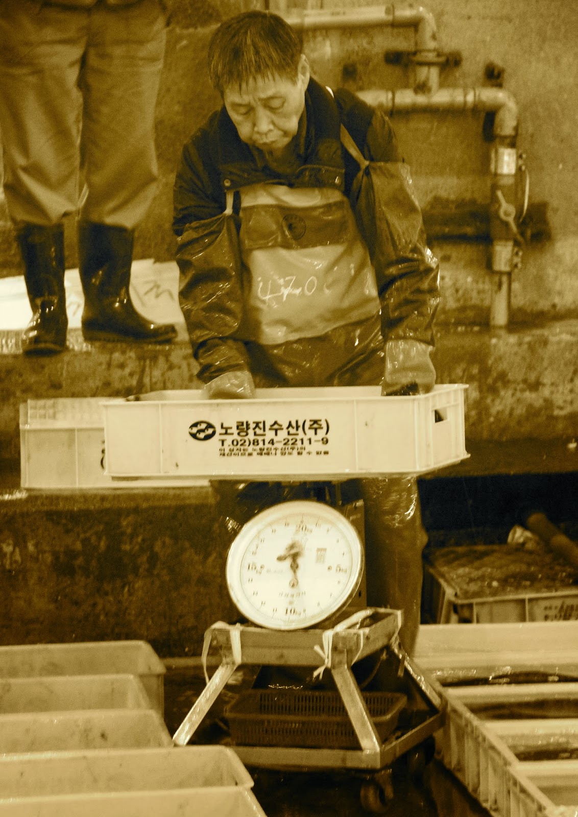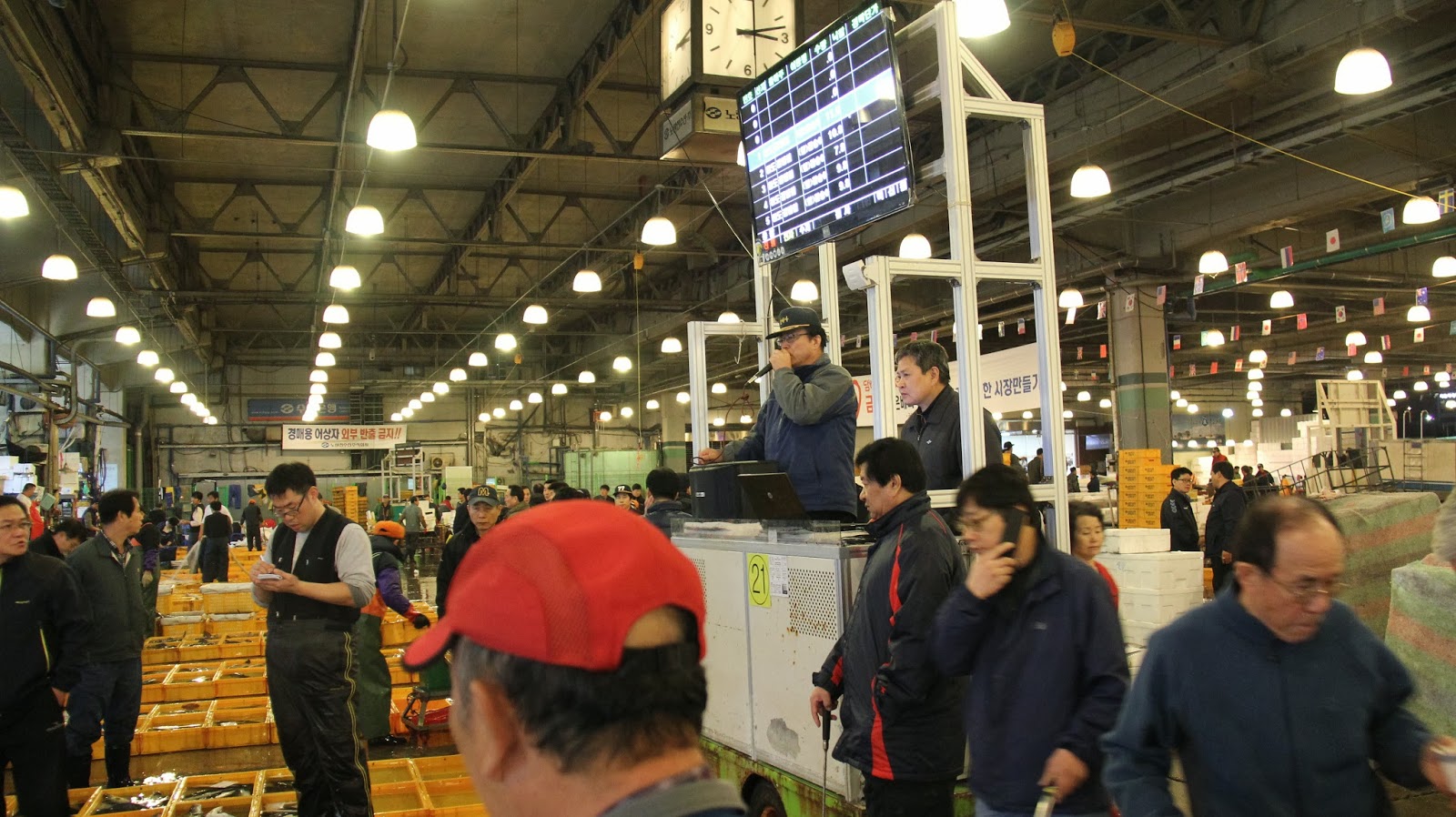 | The auctioneer, my Korean isn’t too hot but there was no way I was going to understand him. He is standing on a little cart that would be driven from place to place to auction off different types of fish. |