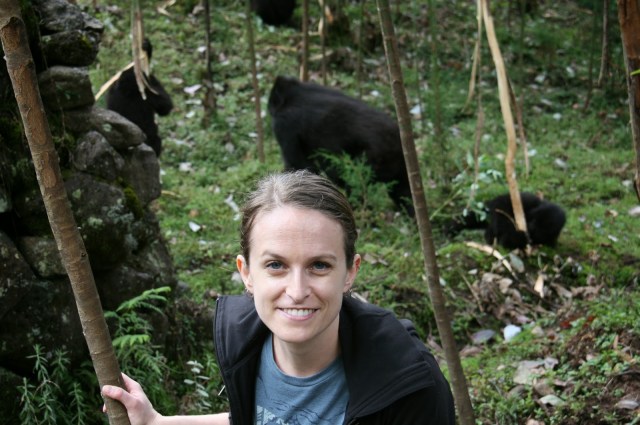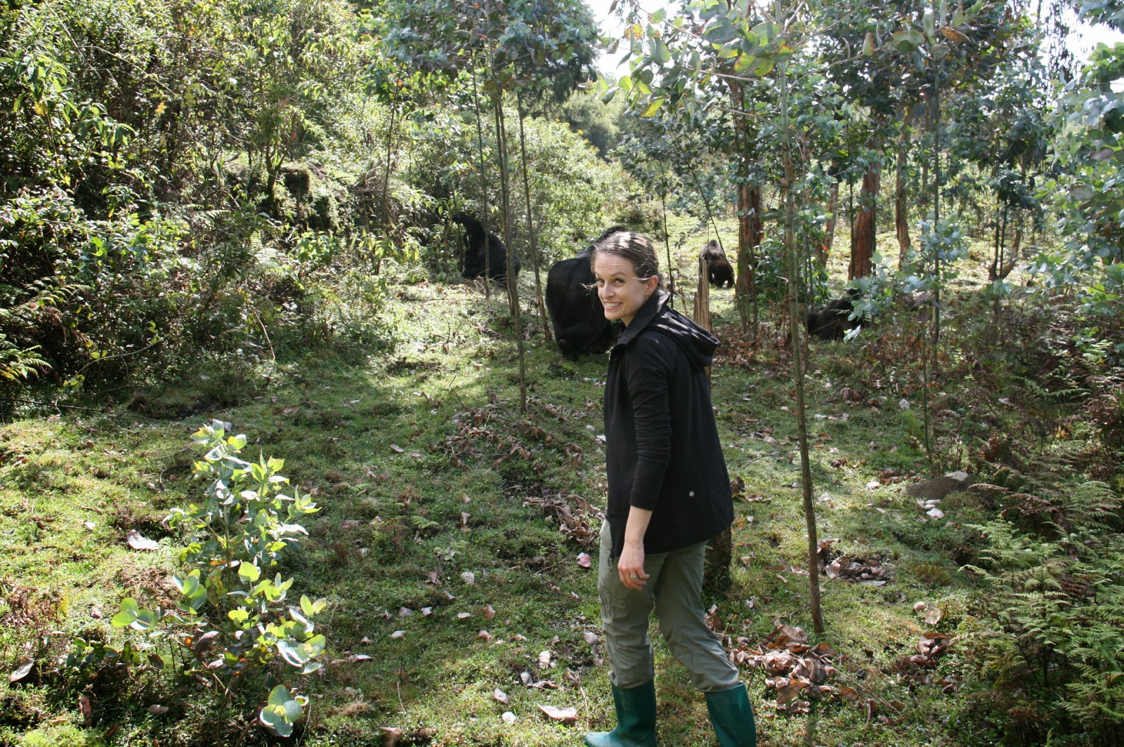 | Caitlin seemingly unaware of the gorillas up ahead. We had to point them out to her. |