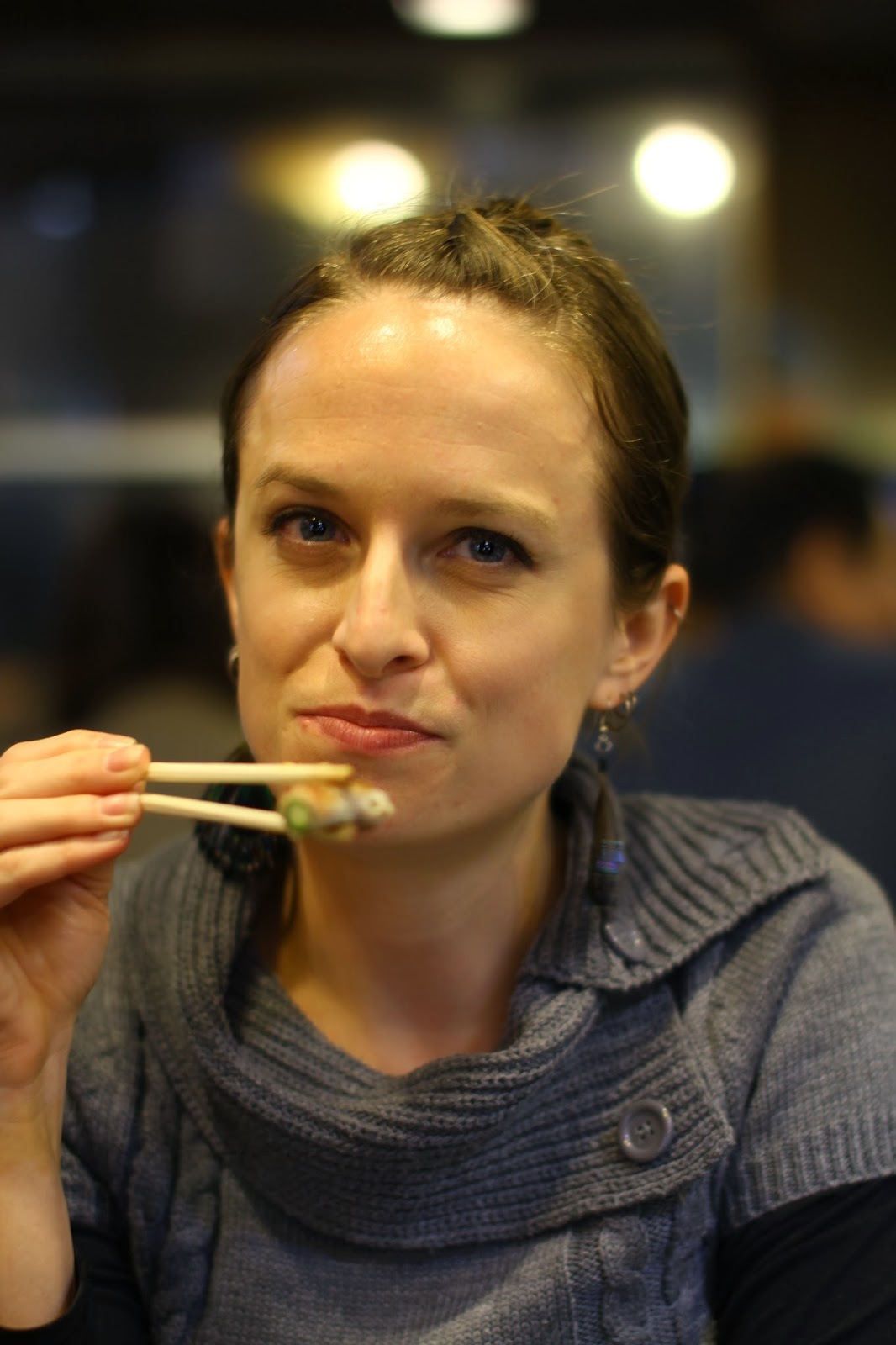 | My beautiful wife, eating bacon wrapped asparagus. |