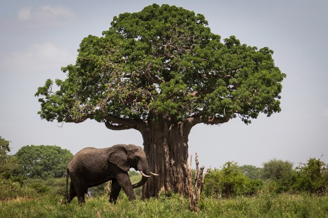 | A solo elephant in front of a Baobab tree. The elephant will scrape the bark off these trees and chew on it during the dry season to get water. We saw one tree that had a hole through the trunk from the elephants. |
