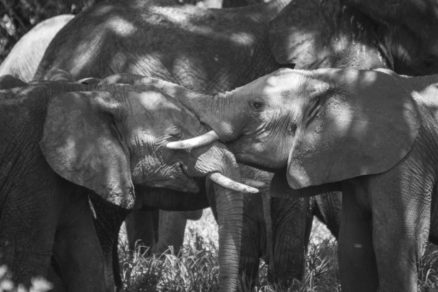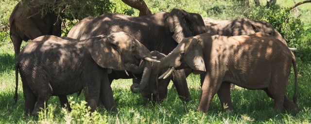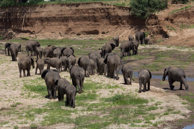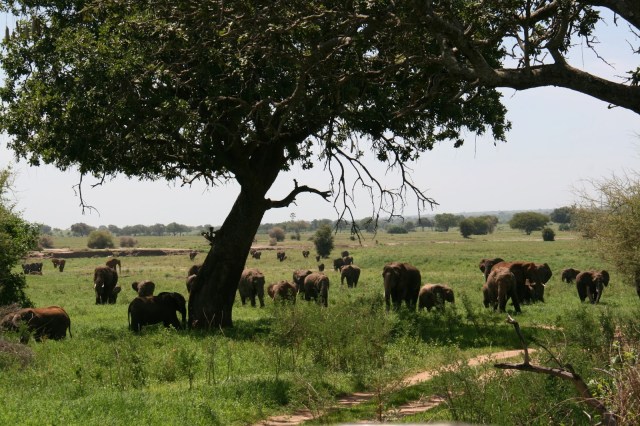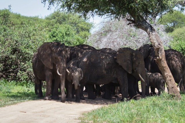 | After we were done watching them pass us, we started to head out only to discover that couldn’t continue because they had stopped in the middle of the road. If you look carefully you’ll see a baby sleeping. Apparently if the baby gets tired it will just lay down and the rest of the herd will circle around the baby and stop. We ended up having to off road it in a wide circle to avoid angering the moms by getting too close. |