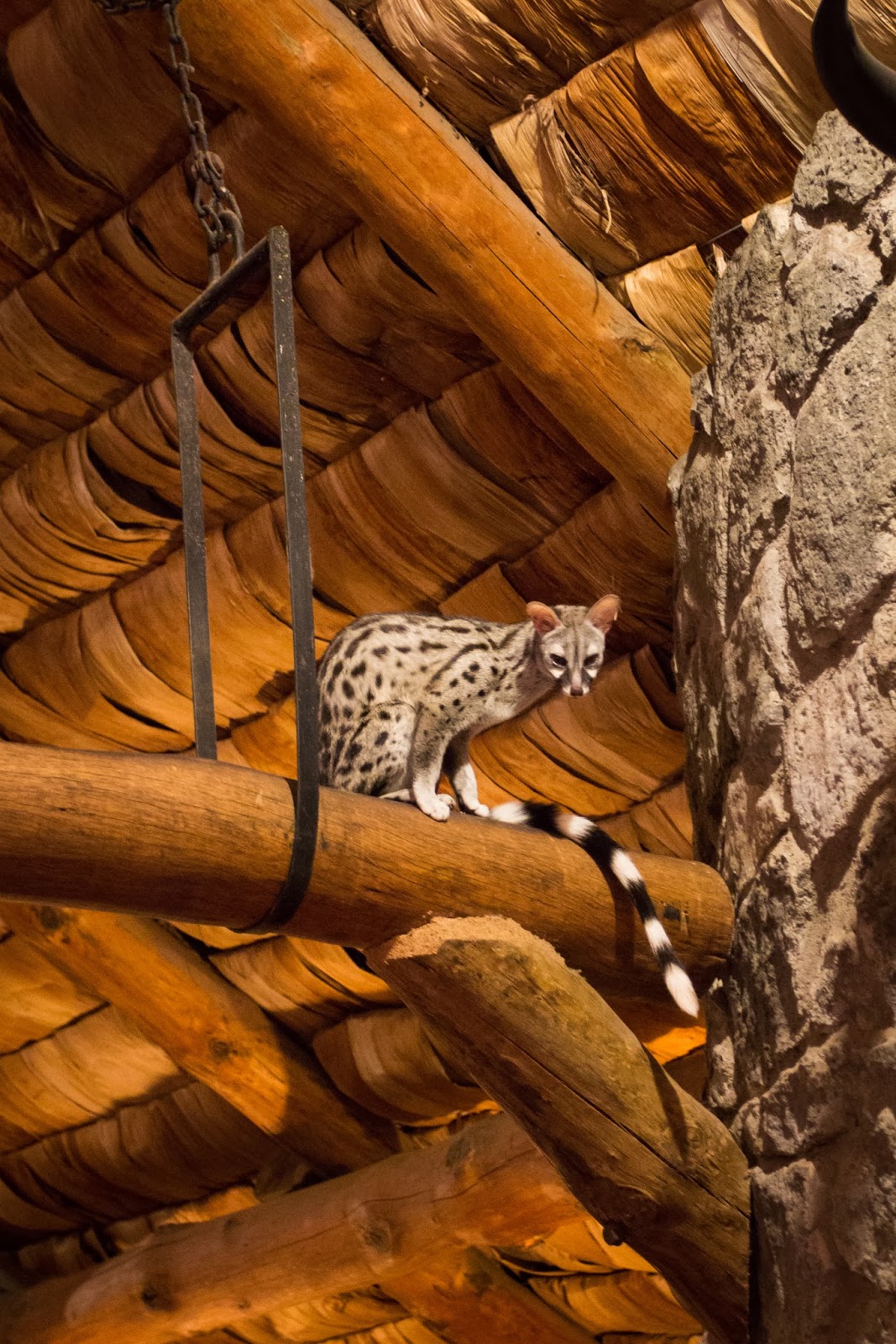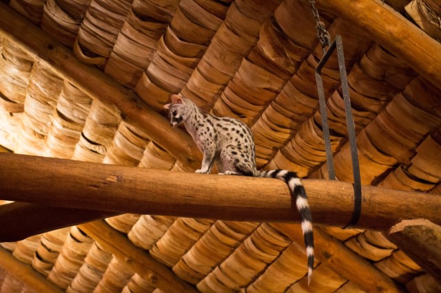 The lodge staff told us that they think this genet has a next in the roof/ceiling. It came down into the dining/bar area before dinner to check out the guests.
