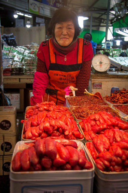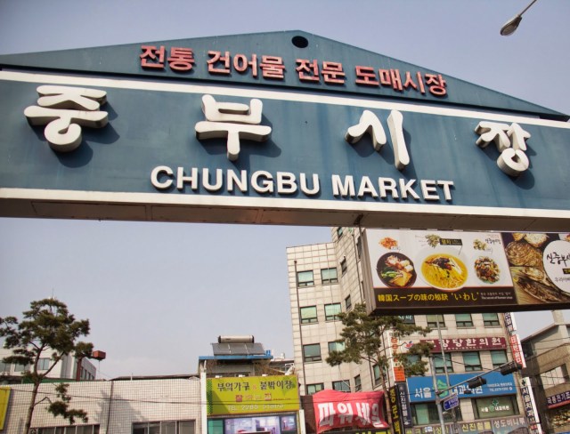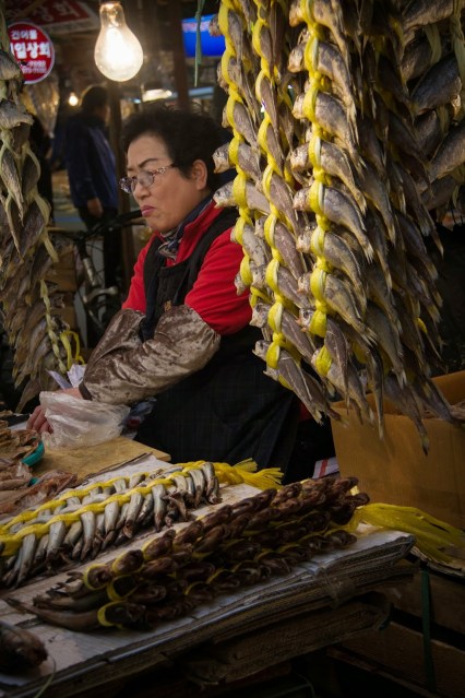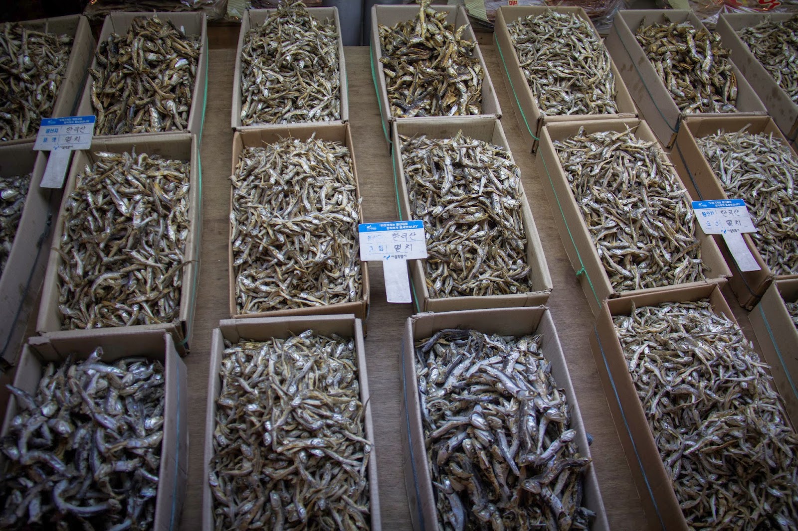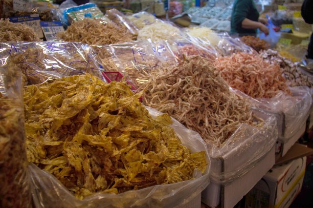 After Kimchi we wandered around Myeongdong and did a little bit of shopping along with taking in the sites. The last stop in Myeongdong was Shinsegae department store. It is a very high end store but has a fancy grocery store with tons of different kinds of kimchi for Sara to take a look at. We grabbed a quick bite to eat there and then headed off to Dongdaemun to check out a little bit of the fabric district along with the baking district. We also stumbled across Chungbu Market which is a dried fish market. I had never been there but it was a cool discovery and was fun to take pictures in. Having guests come and showing them around always reminds me of how much of Seoul I have still not discovered.