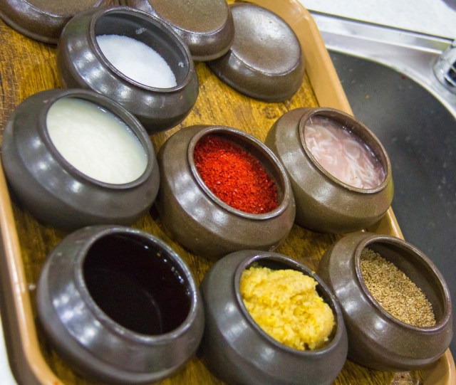 | The ingredients for seasoning Kimchi. (top down, left to right) Sugar, Rice paste, chili powder, salty shrimp, soy sauce or oyster sauce, mix of ginger and garlic, sesame seeds. |