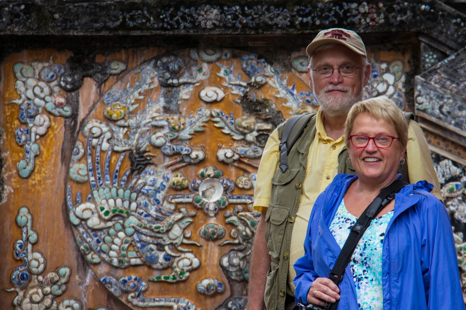 | Gail and bill posing. The mosaic behind them is all broken pottery. |