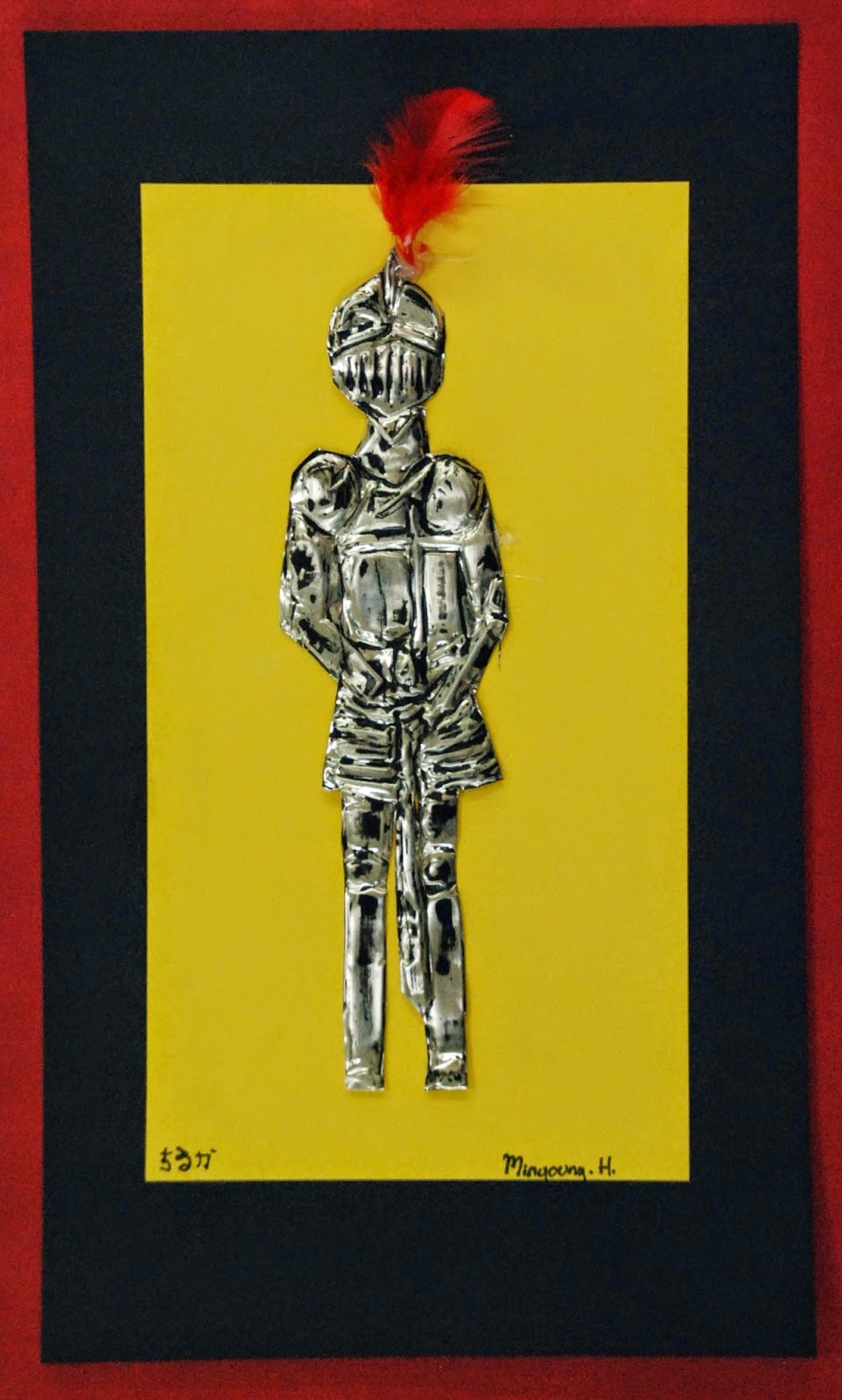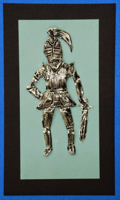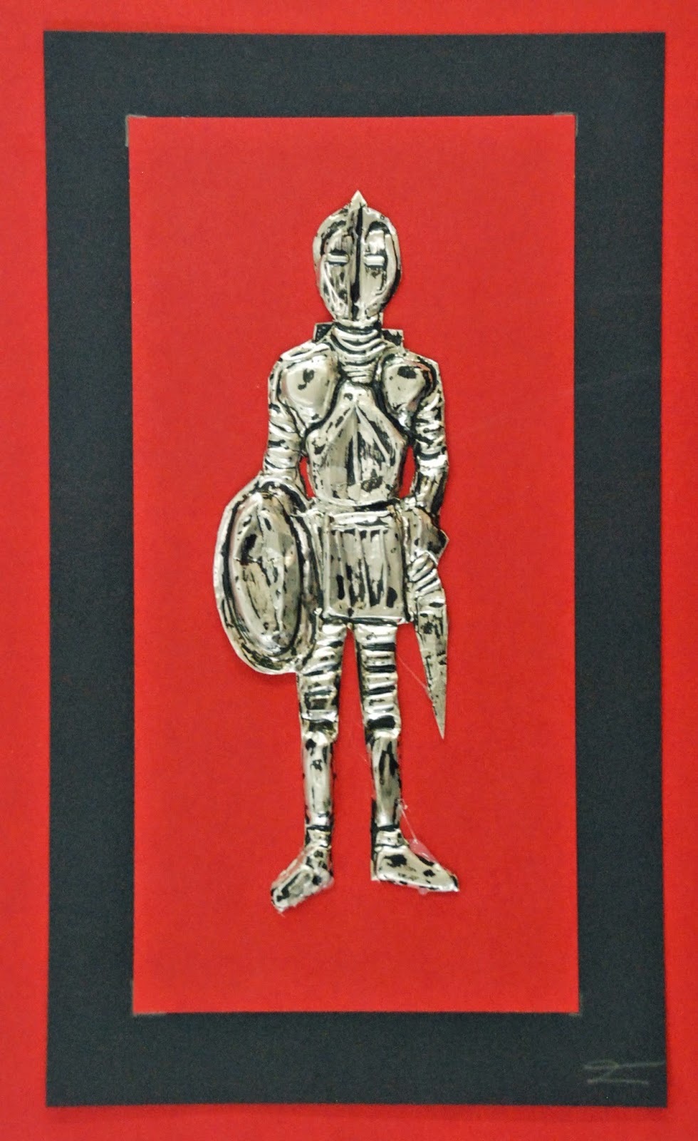 We’re finishing up the year over here in Seoul and one of the final projects my 6th graders have been working on are these suits of plate armor. We learned about texture, relief sculpture and aluminum tooling foil repousse! This is a project that I taught in Honduras, but it’s been awhile since I’ve been able to squeeze it into the curriculum again. I’m glad I found time this year. I love how they turned out! And I also love that all of my high school students have been oohing and ahhing over them for the last week. It’s fun to be able to tell the 6th graders that the high school kids are impressed by their work.