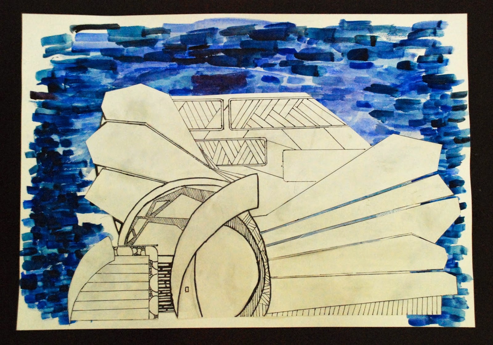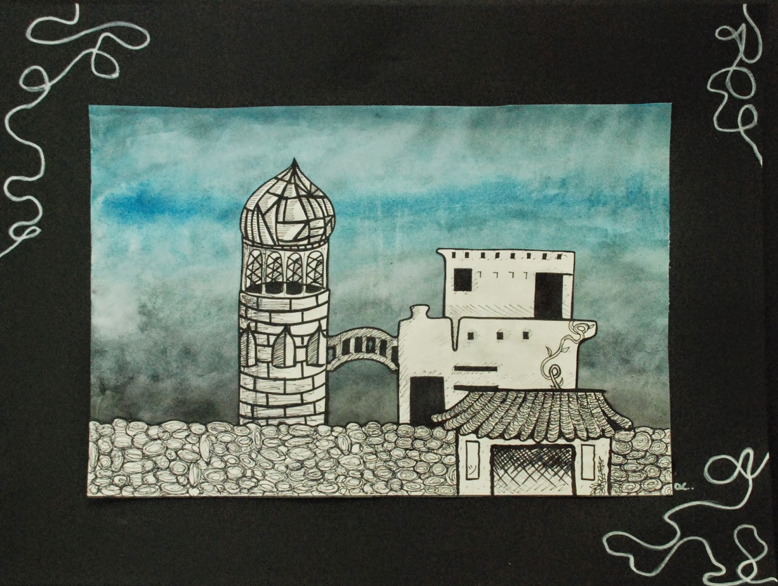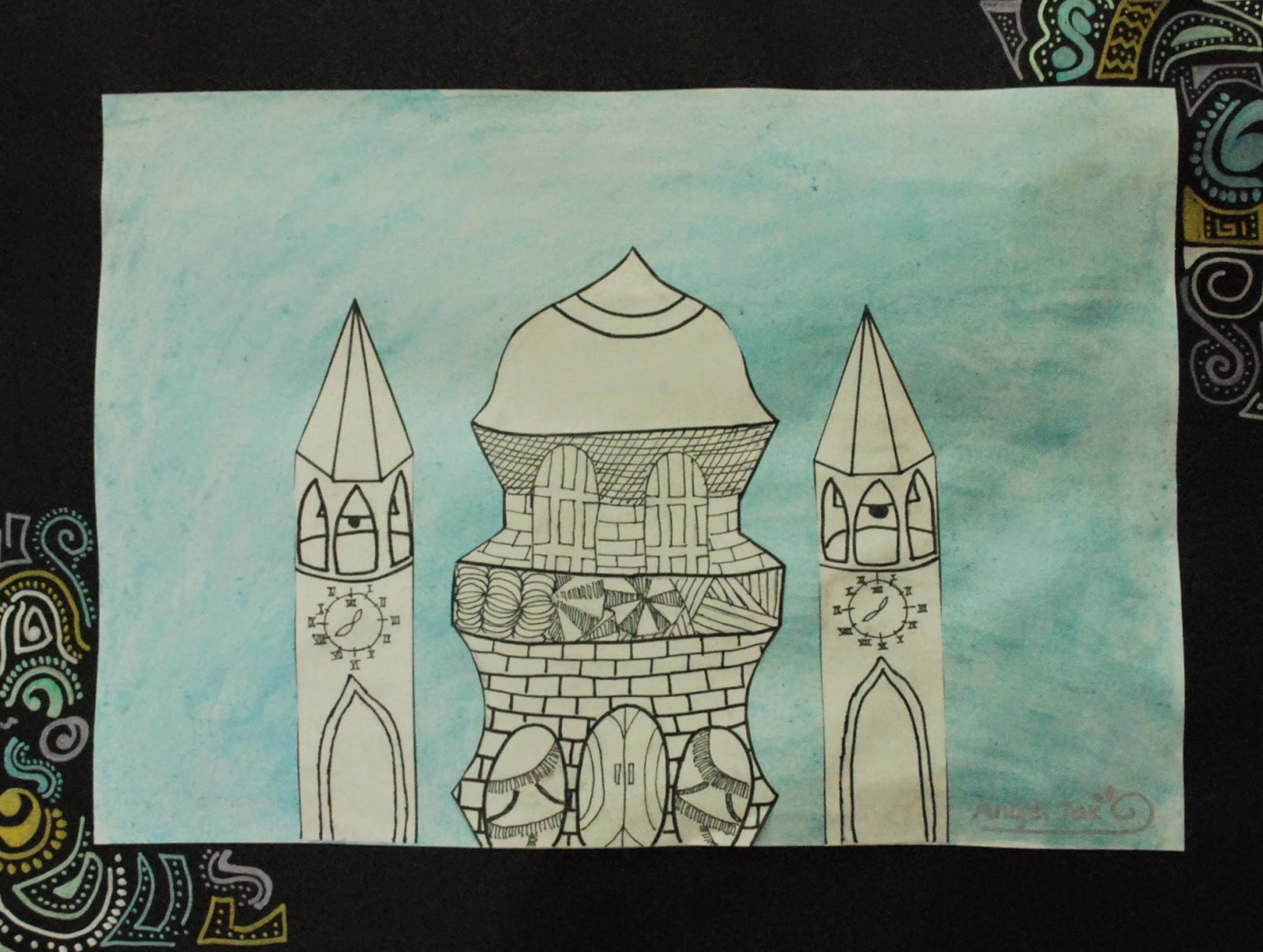 After a change in scheduling this year, I now have my 6th grade students for then entire year instead of just 9 weeks at a time. The added class time has provided lots of opportunities for bringing back some of my favorite projects that we just didn’t have time for over the last two years…like the aluminum armor project and this architecture project that I also taught in Honduras and Ecuador. The students researched a variety of different architectural styles and then designed unique buildings with lots of windows, doors, roofs, textures, etc. We painted watercolor backgrounds to enhance the idea of space in the scene. Check ’em out!