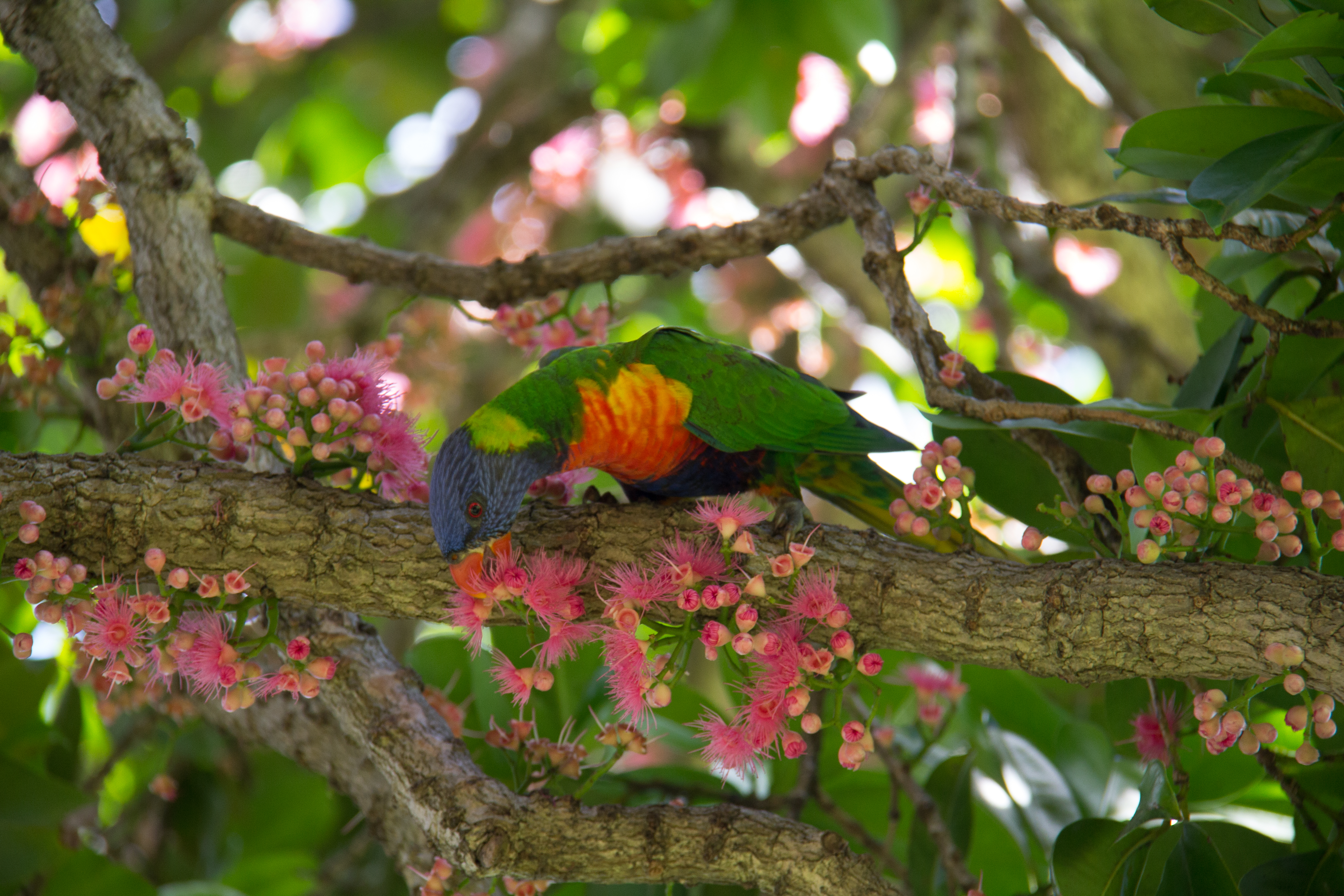 Parrots grazing in the botanical gardens