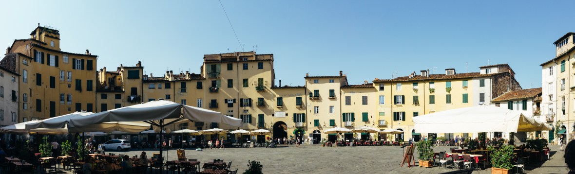 Lucca-14 July 18, 2016 • 3400 × 1034 • Lucca One of the plazas was in a circle with all access being via small alleys.