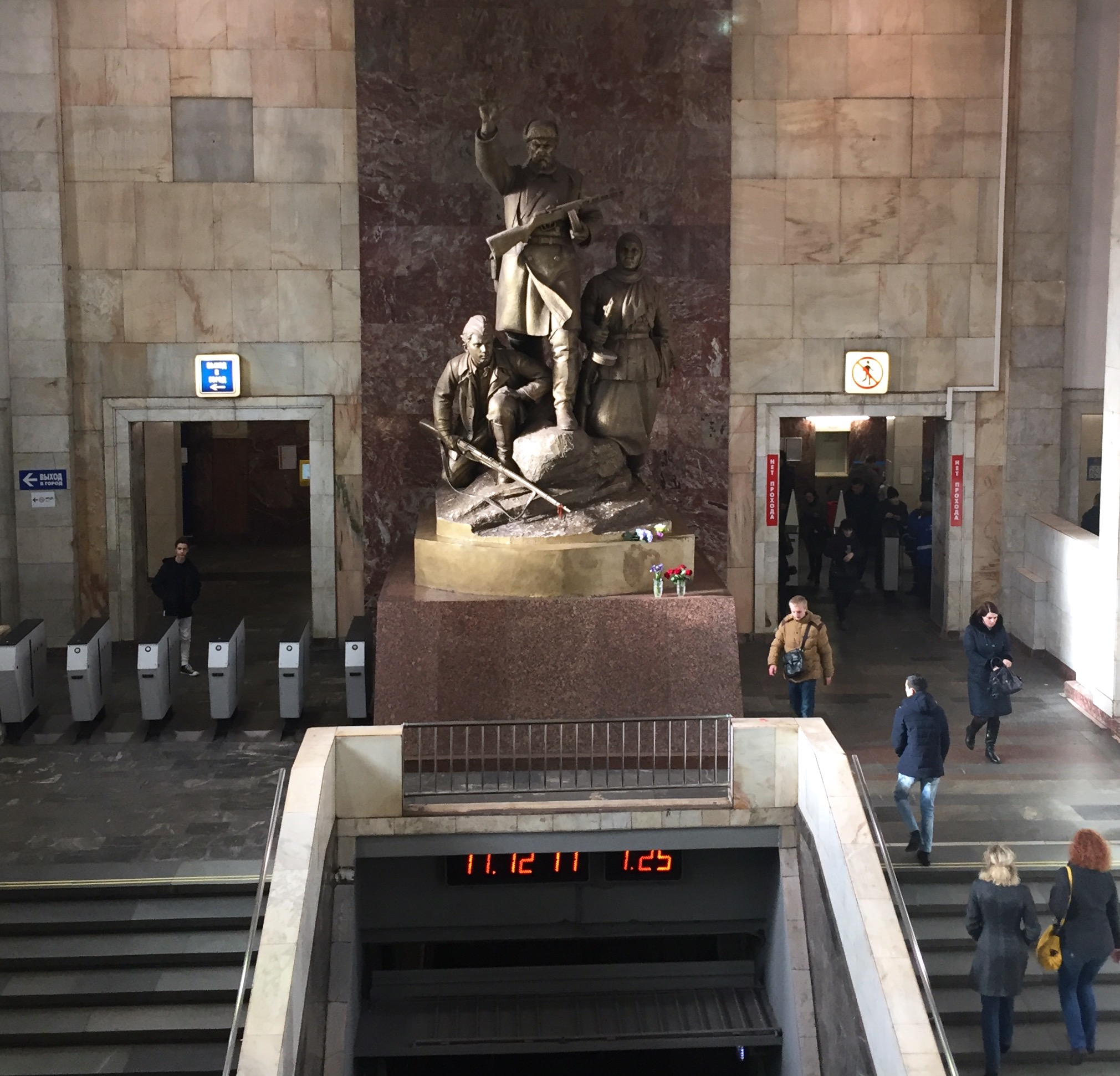 Matvey Manizer, a Russian artist from St. Petersburg, created this bronze sculpture in 1943. I am not sure who the figures in this exact statue are supposed to be, but other statues in the station by the same artist depict Matvey Kuzmin (a Soviet peasant who was killed in WWII and posthumously named Hero of the Soviet Union) and Zoya Kosmodemyanskaya (a Soviet military martyr). The whole station celebrates the Soviet Partisans (hence the name Partizanskaya) which was a group of people who used guerilla warfare against the Axis powers during WWII. More info about the Partisans here.