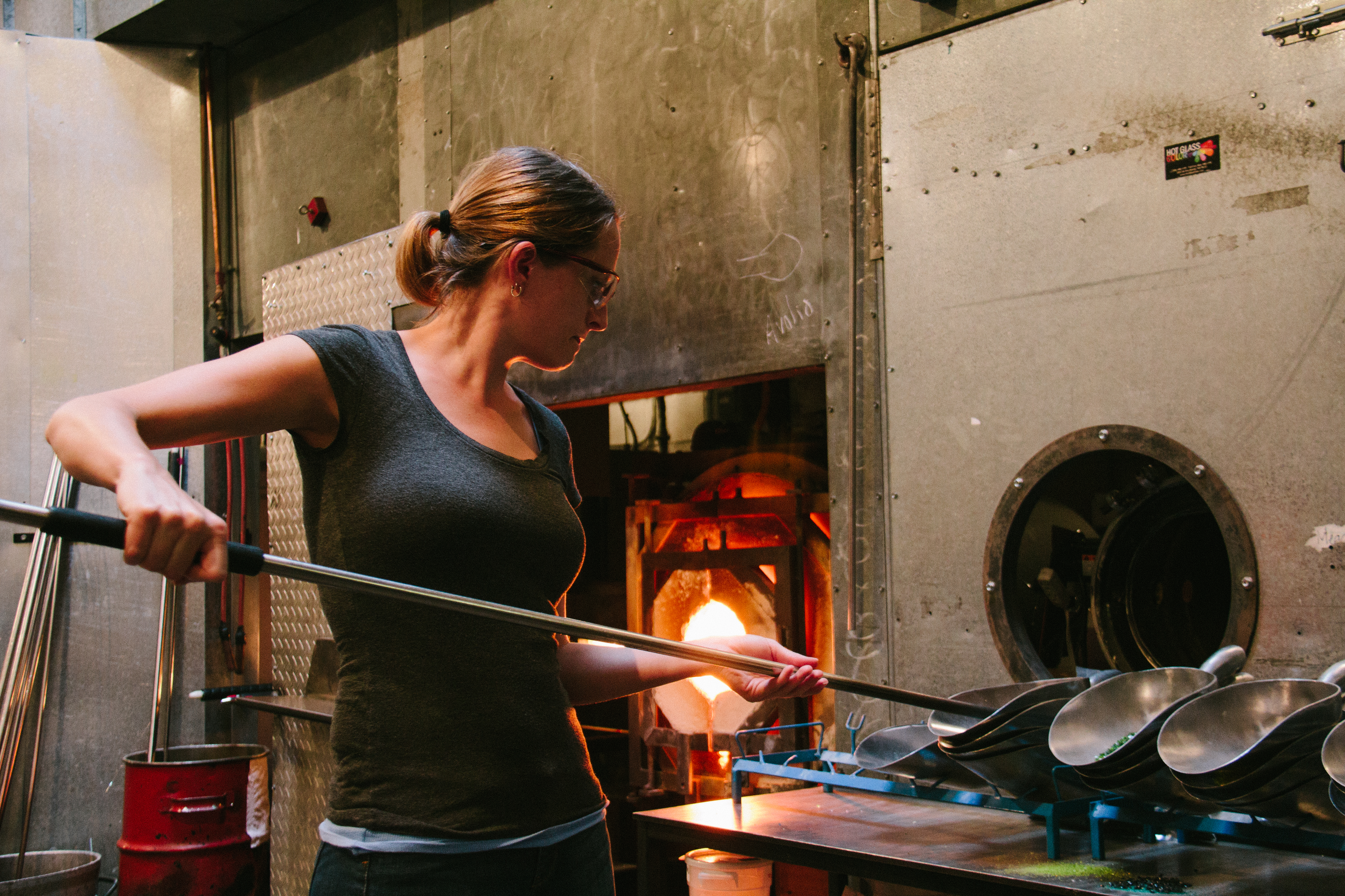 Glass Blowing-6 July 31, 2014 • 5184 × 3456 After placing it in the glory hole she put it into different pans of colored glass.